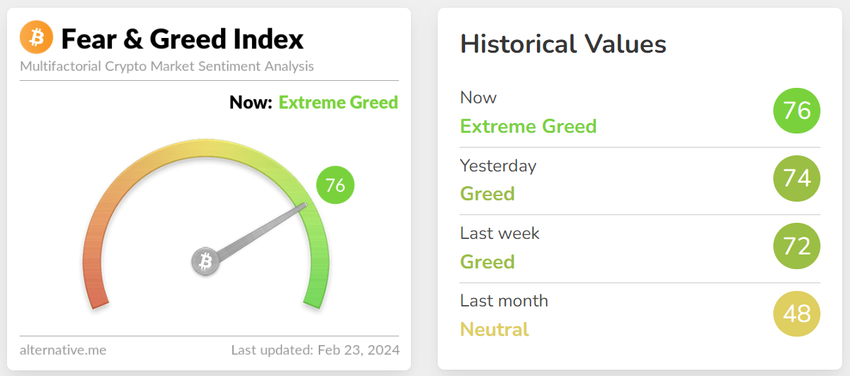 De Fear and Greed Index geeft vandaag een waarde van 76 aan. Dit is een waarde uit het donkergroene gebied van extreme hebzucht. Gewoonlijk duidt een dergelijk sentiment op een naderende correctie, maar het kan relatief lang aanhouden in de cryptocurrency markt.