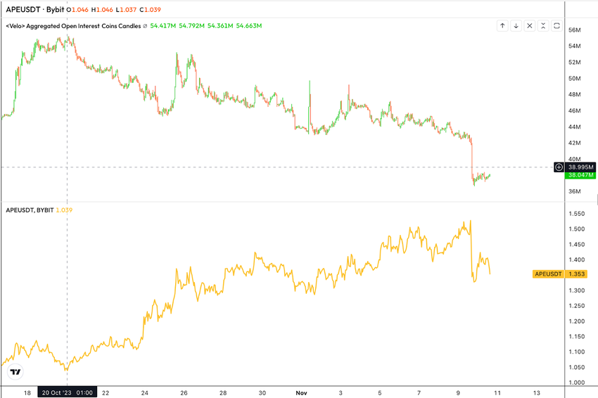 Tussen 20 oktober en 10 november is de open rente op APE met maar liefst 30% gedaald, ondanks de dubbelcijferige koerswinsten in die periode. Zoals te zien is in de Velo grafiek hieronder, daalde de totale open rente van APE van $ 55 miljoen naar $ 38 miljoen, wat neerkomt op een daling van $ 17 miljoen (30%).