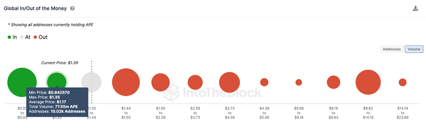 De Global In/Out of the Money data, die alle huidige APE holders groepeert op basis van hun instapkoersen, bevestigt deze voorspelling. Het laat echter zien dat de gigantische koopmuur op $1,20 de eerste steun zou kunnen vormen.