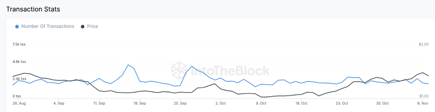 Sinds de overschrijding van de 4.460 transacties op 27 september is het aantal dagelijkse APE-transacties sterk gedaald. Op 10 november noteerde APE slechts 2.020 transacties, meer dan 50% low ten opzichte van de piek in september.