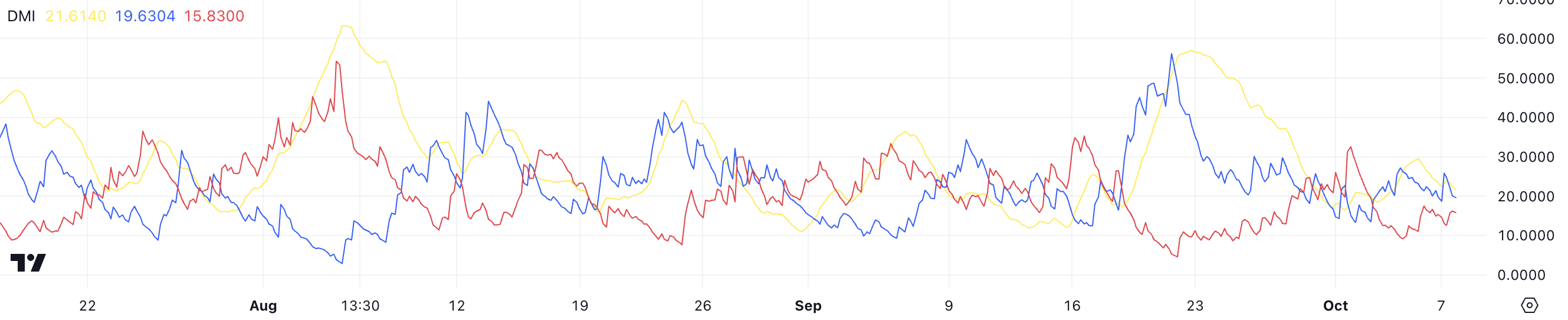 De huidige waarden van Aptos (APT) DMI tonen een zwakke trend. De ADX staat op 21,61, wat wijst op een laag marktmomentum. De +DI staat op 19,63, net iets boven de -DI op 15,83. Dit suggereert dat bulls een klein voordeel hebben, maar het is niet genoeg om sterke bullish actie aan te geven.