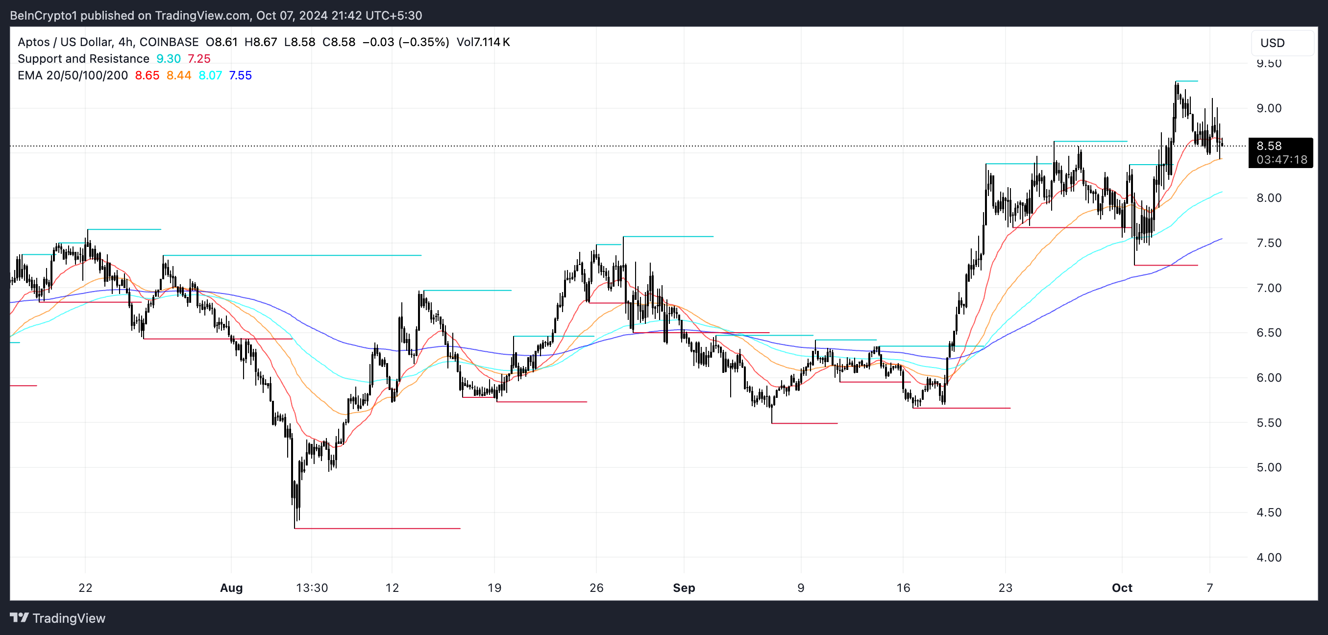 Met steun- en weerstandsniveaus die cruciaal worden, lijkt Aptos zich voor te bereiden op een significante beweging in een van beide richtingen. De markt lijkt te wachten op een duidelijk signaal voordat een beslissende stap wordt gezet.