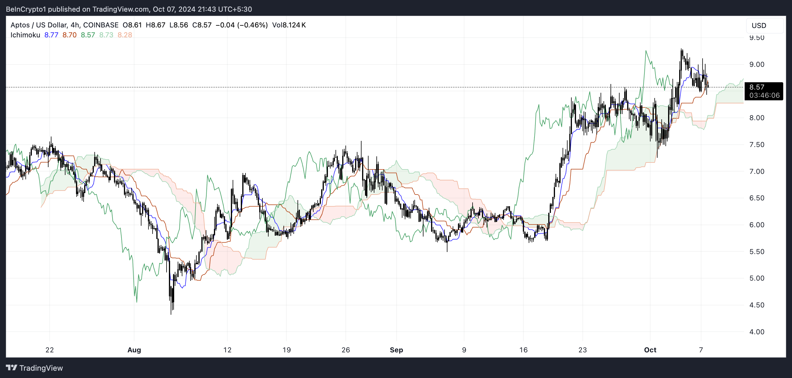 Aptos (APT) Ichimoku Cloud geeft momenteel een gemengde trend aan. De koers staat op $8,57, iets onder zijn recente piek van $9. Het blijft boven de Kumo (wolk), wat wijst op een mogelijke bullish voortzetting.