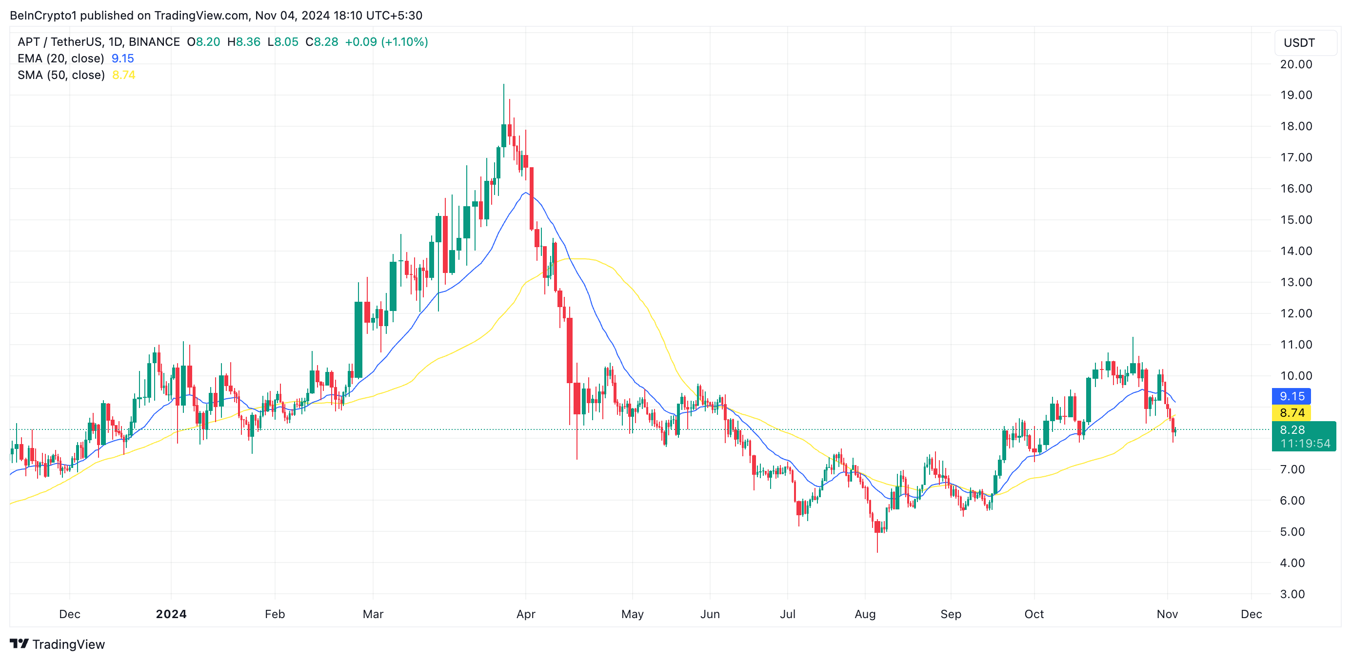 In de afgelopen week is de koers van APT met 8% gedaald. Deze daling heeft de waarde van de coin onder zijn 20-daagse exponential moving average (EMA) en 50-daagse small moving average (SMA) geduwd. De 20-daagse EMA meet de gemiddelde koers van een activum over de afgelopen 20 handelsdagen, terwijl de 50-daagse SMA de koers over de afgelopen 50 handelsdagen volgt.