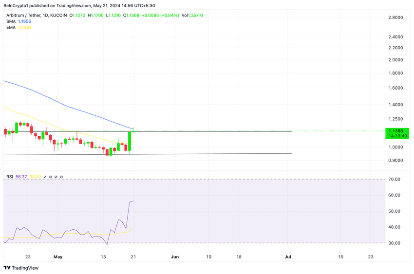 Naast een rally boven de weerstand op $1,13, noteert de koers van ARB nu boven zijn 20-daags Exponential Moving Average (EMA) en zijn 50-daags Small Moving Average (SMA).
