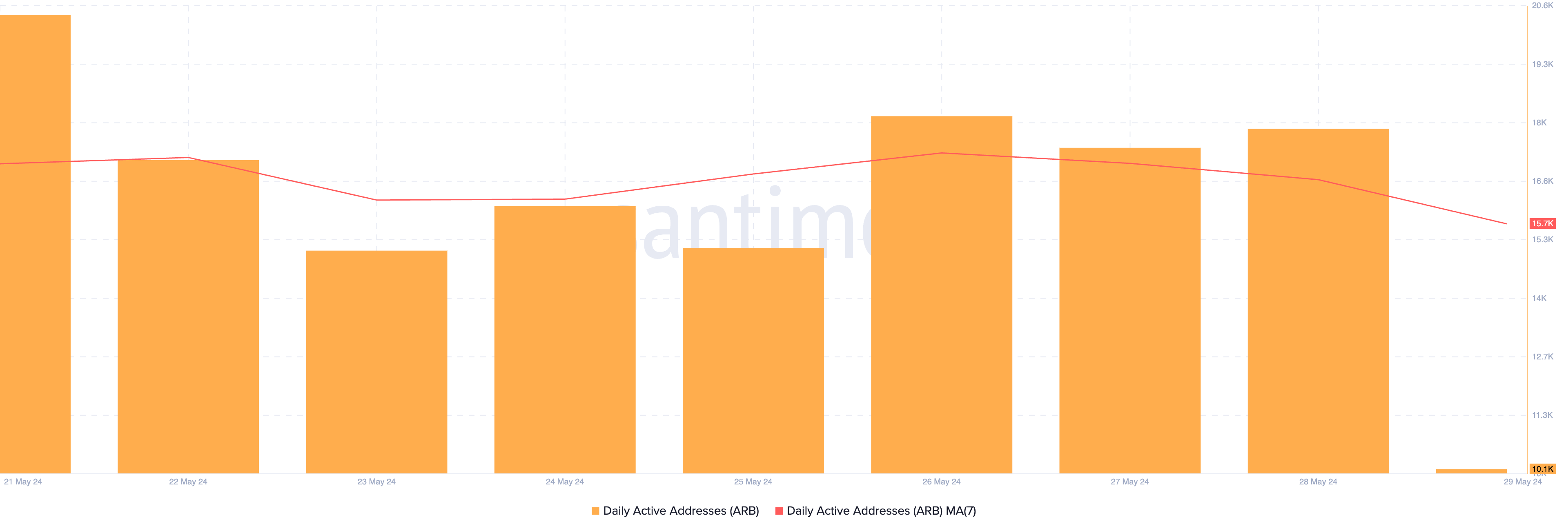 De daling van de dagelijkse actieve ARB-adressen maakt een neerwaartse correctie van de koers waarschijnlijker. On-chain data beoordeeld met behulp van een 7-daagse moving average dat in de afgelopen week het aantal dagelijkse adressen dat ARB-transacties uitvoert met bijna 10% is gedaald.