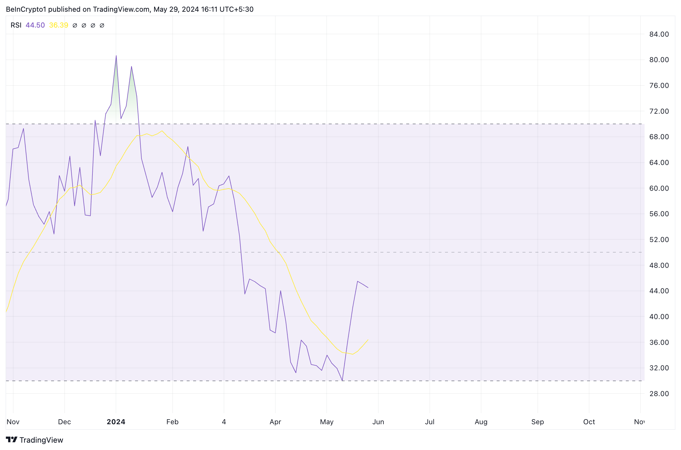 De Relative Strength Index (RSI) van Arbitrum bevond zich op het moment van schrijven onder de 50-neutrale zone. Deze indicator meet het momentum van de koersbeweging van een asset.