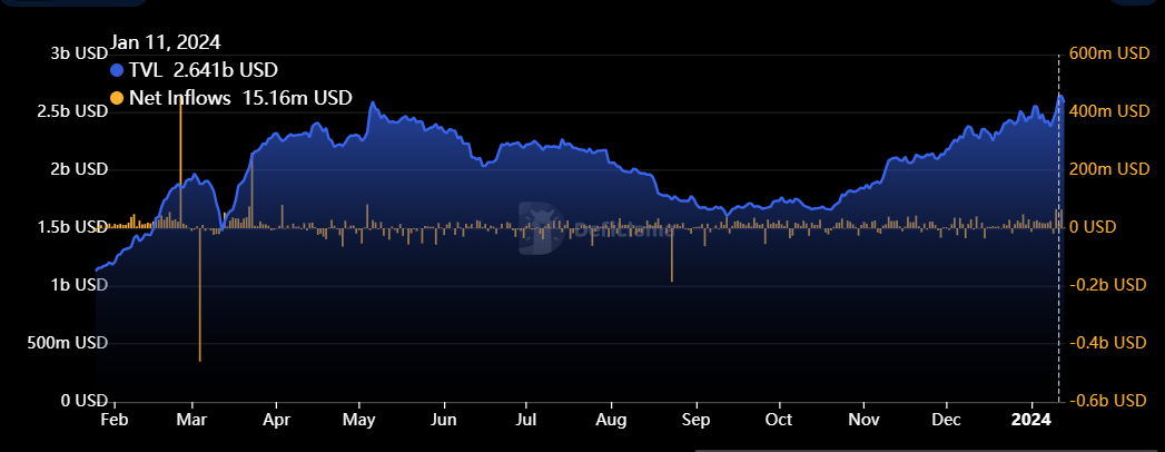 SponsoredSinds het begin van het jaar is blockchain getuige geweest van een opmerkelijke positieve netto stroom van meer dan $250 miljoen. Deze stijging heeft Arbitrum’s TVL naar een indrukwekkende all-time high gestuwd. Het bereikte op 12 januari $2,64 miljard.