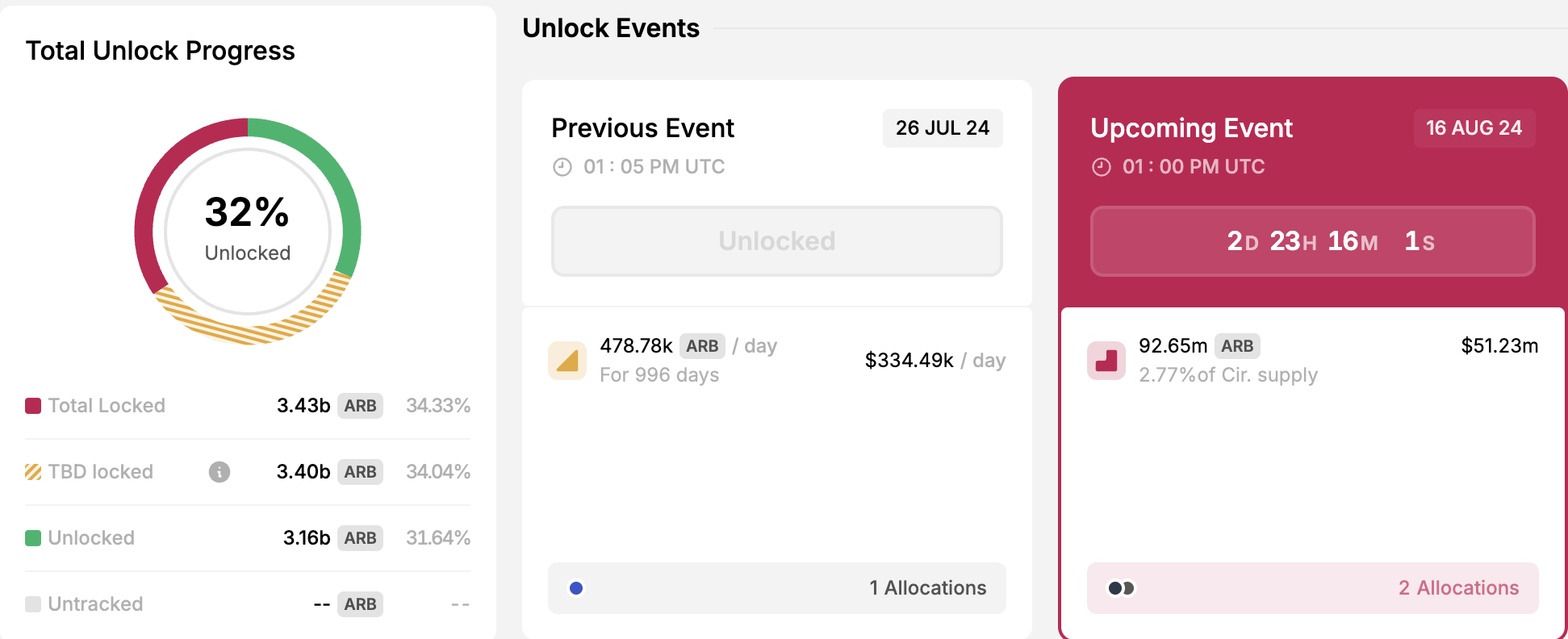 Hoewel dit belangrijke gebeurtenissen zijn, is de aanstaande token unlock waarschijnlijk de drijvende kracht achter de verhoogde marktinteresse in ARB. Volgens Token Unlocks zal Arbitrum nog eens 2,77% van zijn circulerende aanbod vrijgeven op 16 augustus. Tegen de huidige koers zijn deze tokens ongeveer $51,2 miljoen waard.