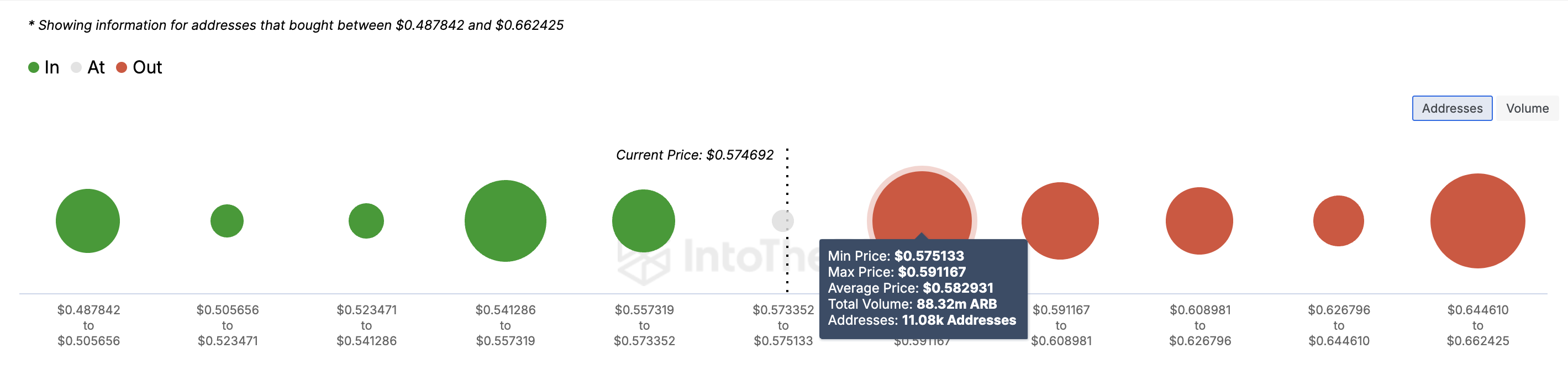 Over het algemeen, hoe groter het aantal adressen in een specifieke prijsklasse, hoe sterker de steun of weerstand. Op dit moment houden meer dan 11.000 adressen 88,32 miljoen ARB-tokens vast met verlies, met een gemiddelde on-chain kostprijs van $0,58.