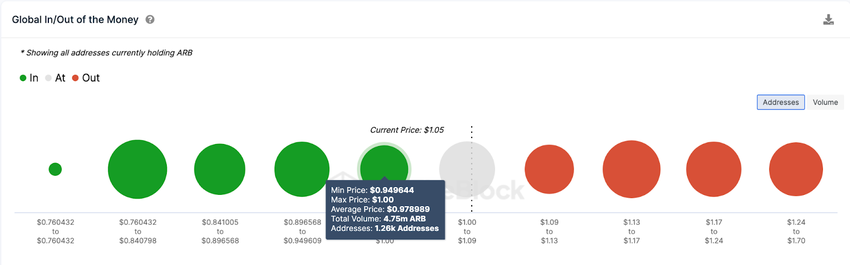De Global In/Out of the Money (GIOM) data, die de huidige ARB holders groepeert op basis van hun instapkoersen, bevestigt deze Arbitrum verwachting.