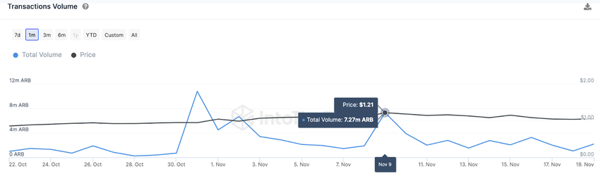 De grafiek hieronder laat zien dat 7,27 miljoen ARB tokens werden verhandeld toen de Arbitrum koers op 9 november een maandelijkse piek van $1,21 bereikte. Sindsdien is de vraag met maar liefst 70% gedaald. Op 19 november werden er slechts 2,18 miljoen tokens verhandeld.