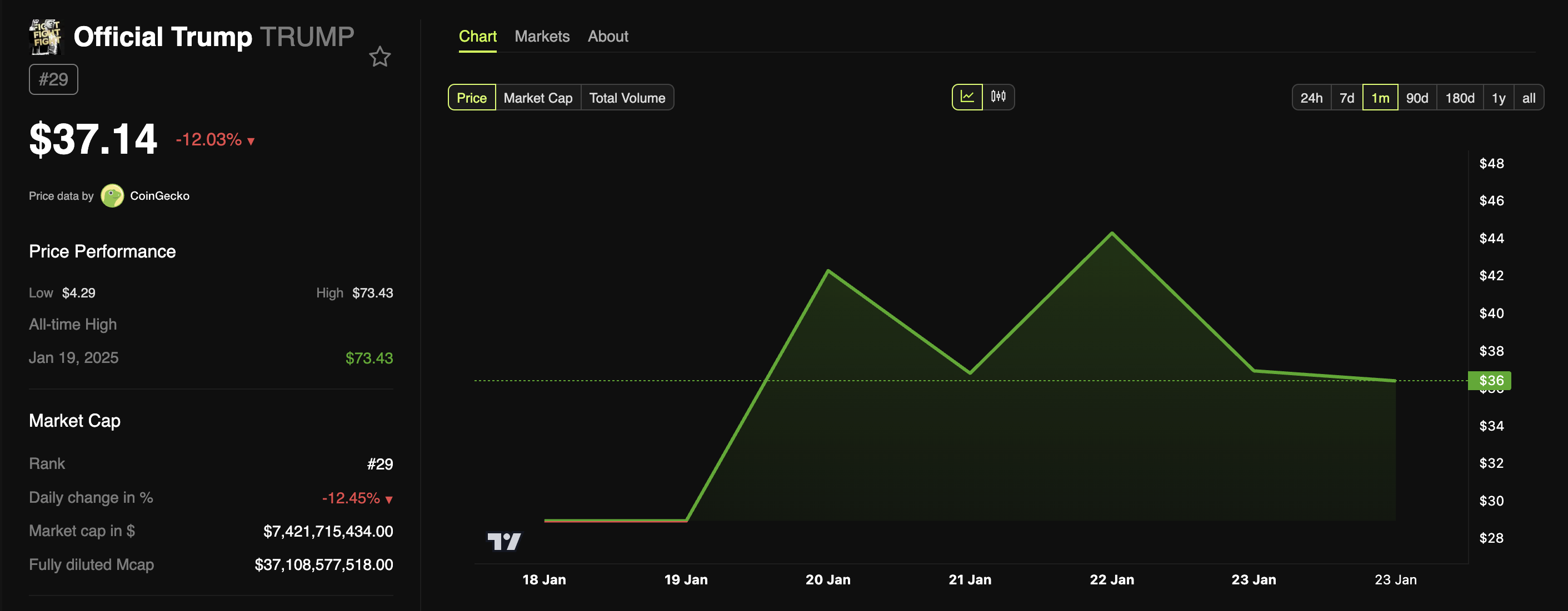 TRUMP heeft echter ook aanzienlijke marktaandacht gekregen, ondanks dat het een nieuwe deelnemer is. Het heeft een marktkapitalisatie van $7,42 miljard en staat daarmee op de 29e plaats als grootste cryptocurrency en de derde grootste meme coin qua marktkapitalisatie.