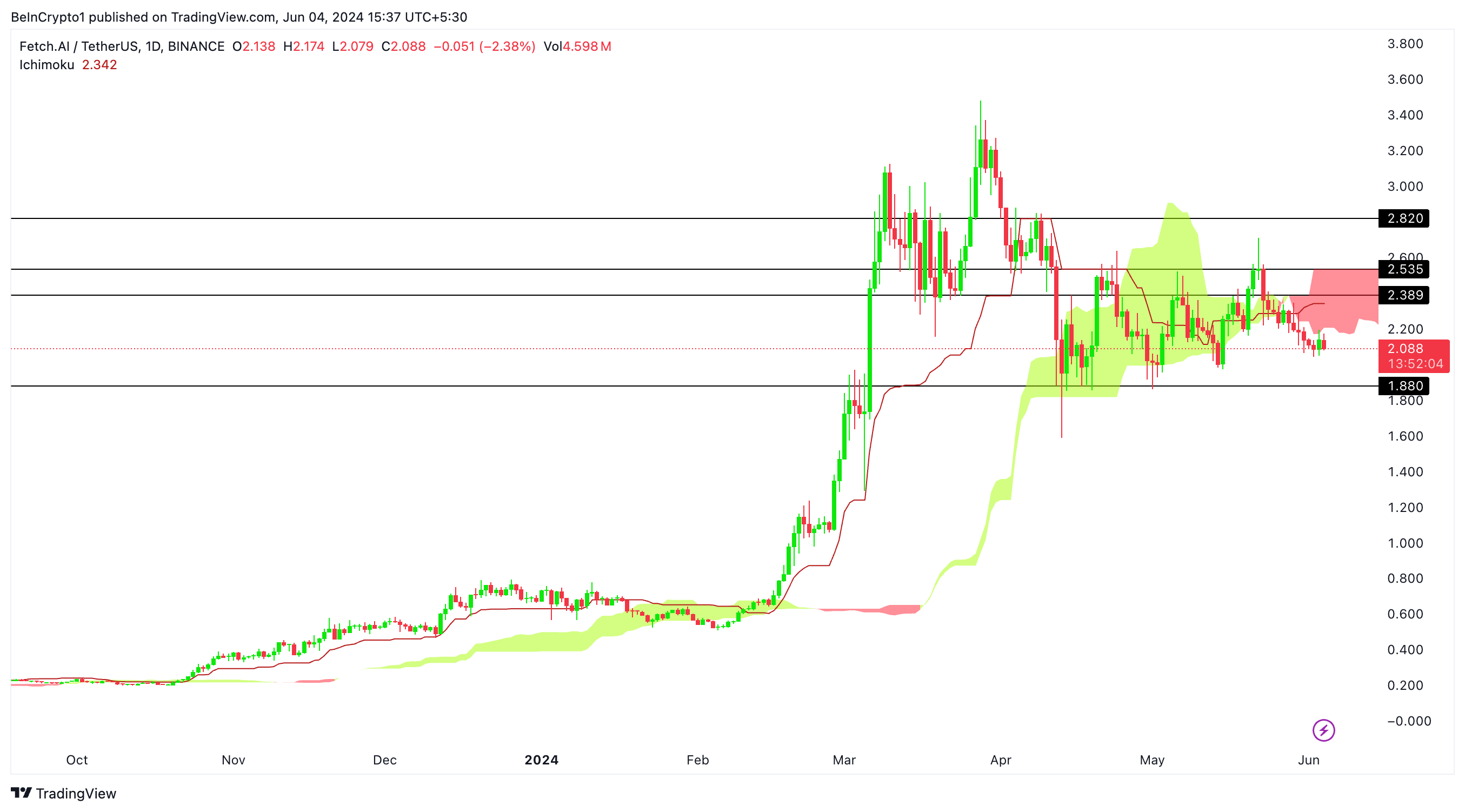 De Fetch.ai (FET) koers test momenteel een cruciaal steunniveau en probeert onder de Ichimoku Cloud op de dagelijkse grafiek te breken. Als deze neerwaartse trend aanhoudt en FET er niet in slaagt om de ondergrens van de wolk te herstellen, is een verdere koersdaling naar $1,8 mogelijk.