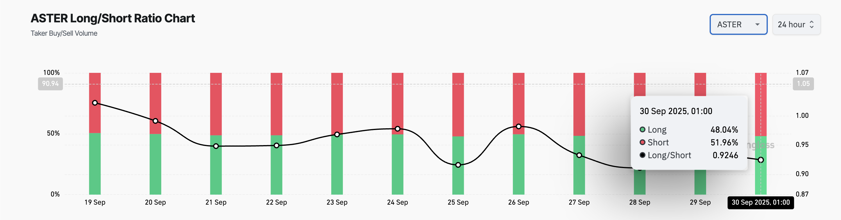 De long/short-ratio van ASTER bevestigt dat shorts de markt domineren, met meer handelaren die zich positioneren voor koersdalingen dan voor herstel. Dit kan resulteren in een verder verlies van vertrouwen, wat de waarde van de altcoin verder omlaag kan duwen.