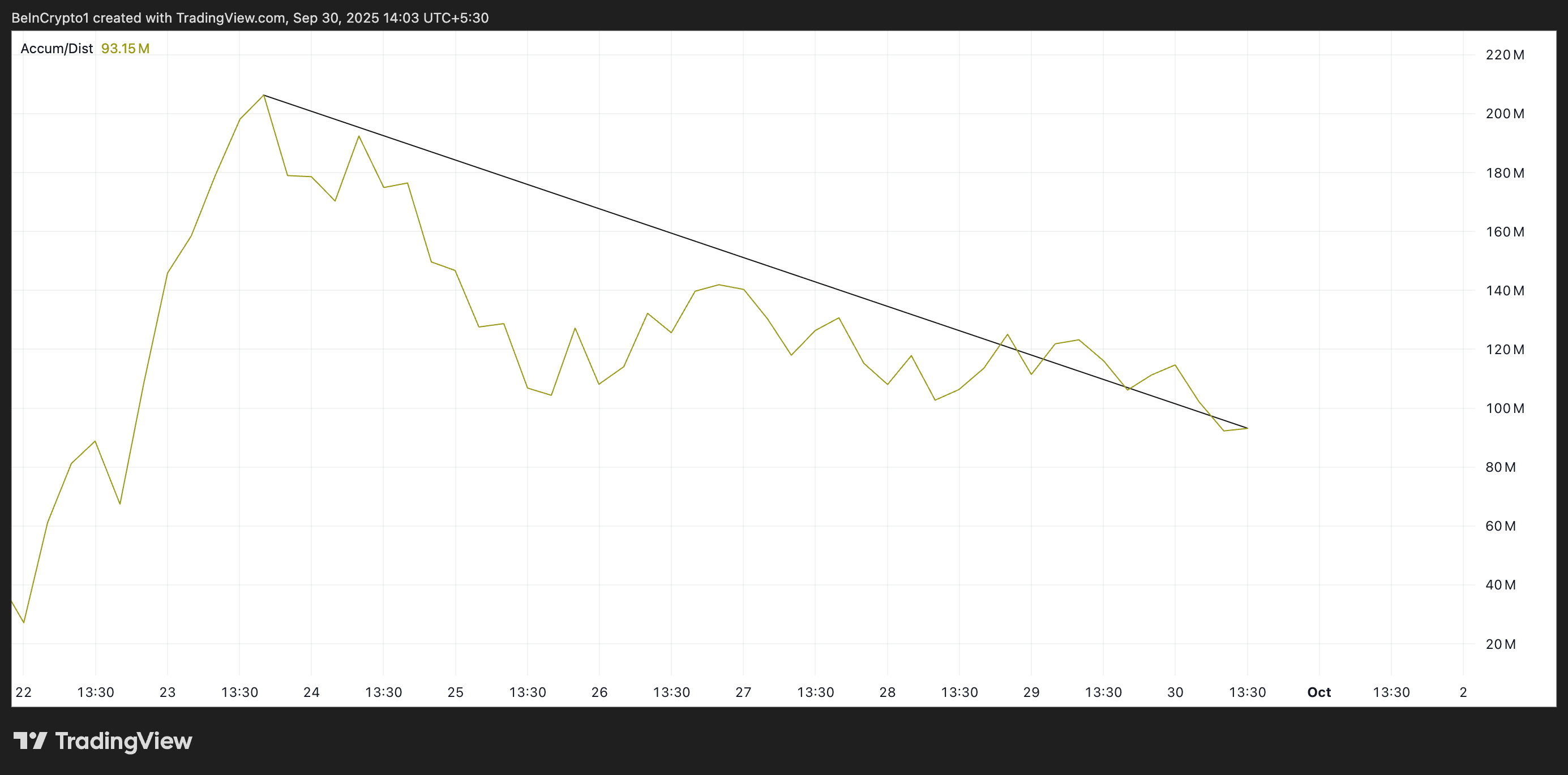 Bovendien bevestigt op de vier-uur-grafiek de dalende Accumulation/Distribution (A/D) Line van de crypto de afnemende koopinteresse.