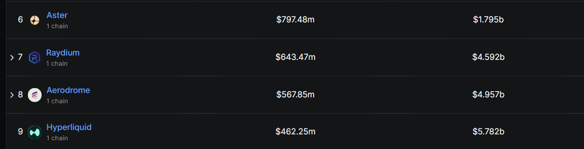 Die prestatie bracht Aster in de top zes van gedecentraliseerde exchanges op basis van volume, terwijl Hyperliquid naar de negende plaats zakte.