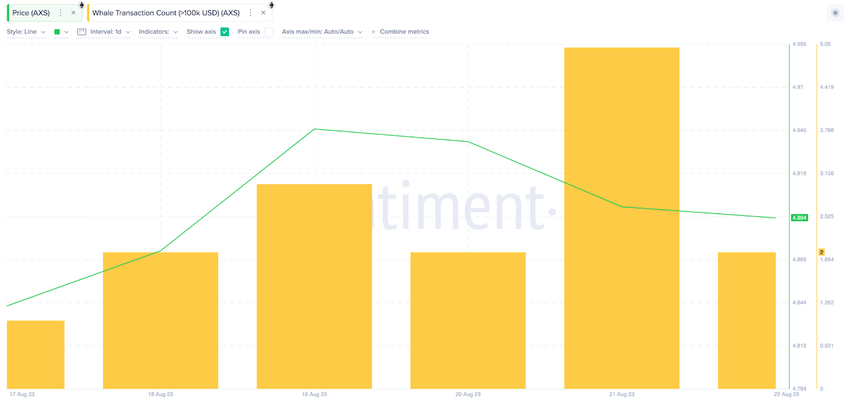 Zoals hieronder te zien is, registreerde AXS slechts 1 whale transactie op 17 augustus. Maar dat aantal groeide naar 5 op 21 augustus.