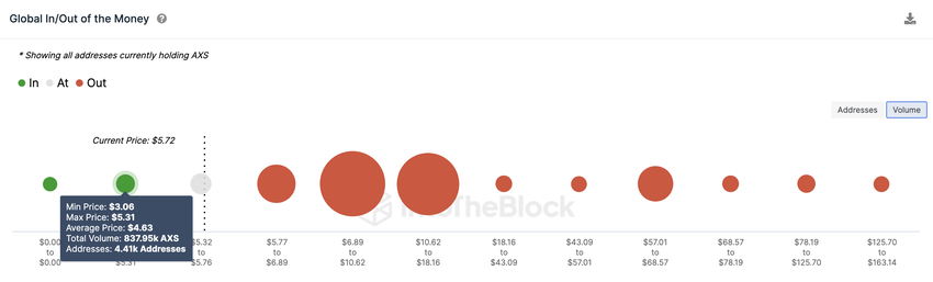 De Global In/Out of the Money (GIOM) data, die Axie Infinity holders groepeert op basis van hun instapkoersen, bevestigt deze Axie Infinity coin verwachting. Echter laat het zien dat bulls een sterke buy-wall op $5,30 zouden kunnen opzetten.