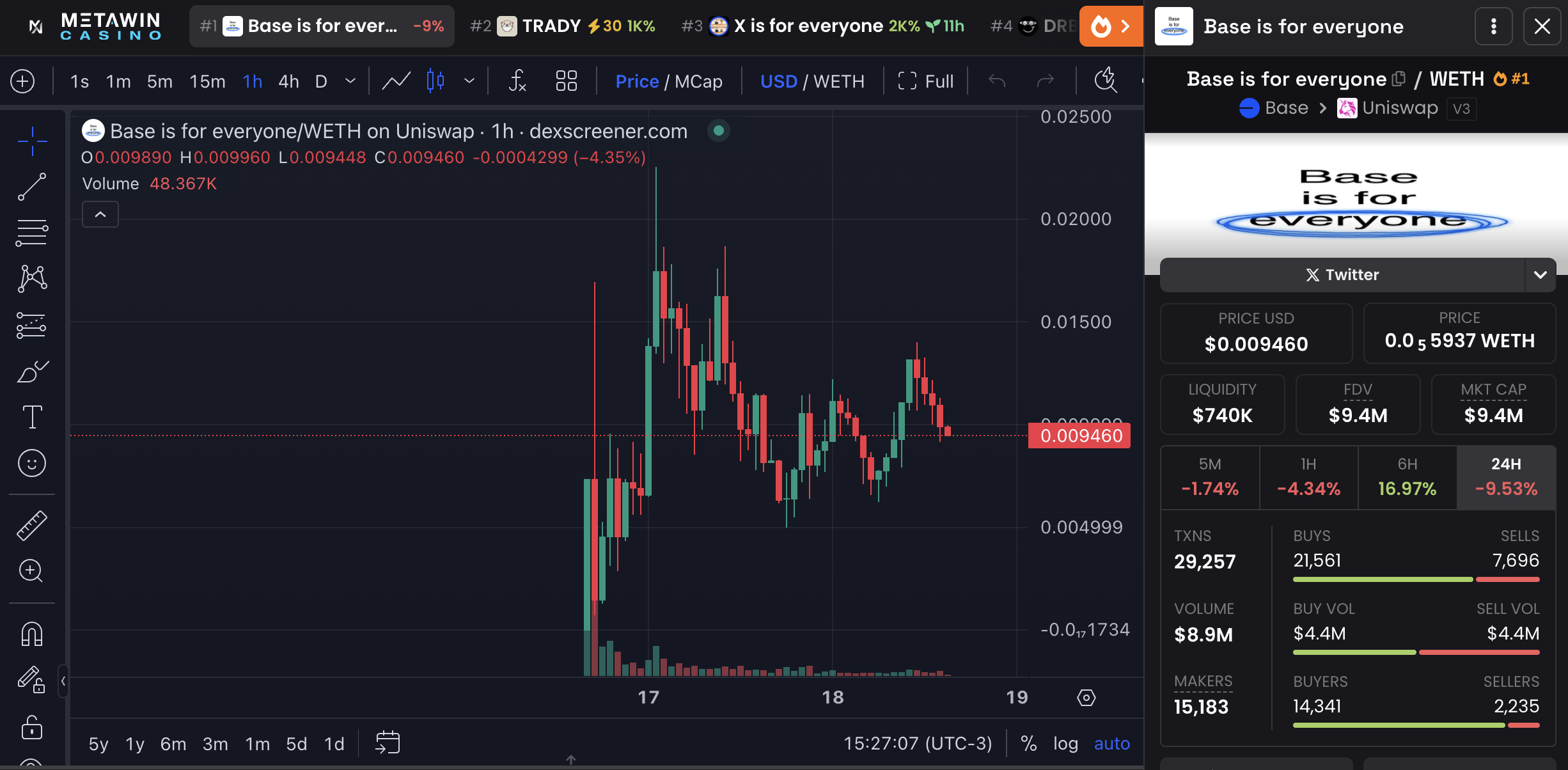 SponsoredDe coin heeft aanzienlijke tractie gekregen in termen van activiteit, met momenteel bijna 21.000 houders, meer dan 29.000 transacties in de afgelopen 24 uur en een dagelijks handelsvolume van bijna $9 miljoen.