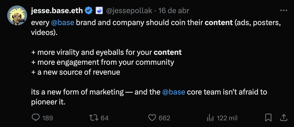 David Tso (@davidtsocy), die bij Base werkt, geeft een meer ondersteunende draai door content coins te vergelijken met “Instagram-posts en TikToks die hun waarde in real-time laten zien”.