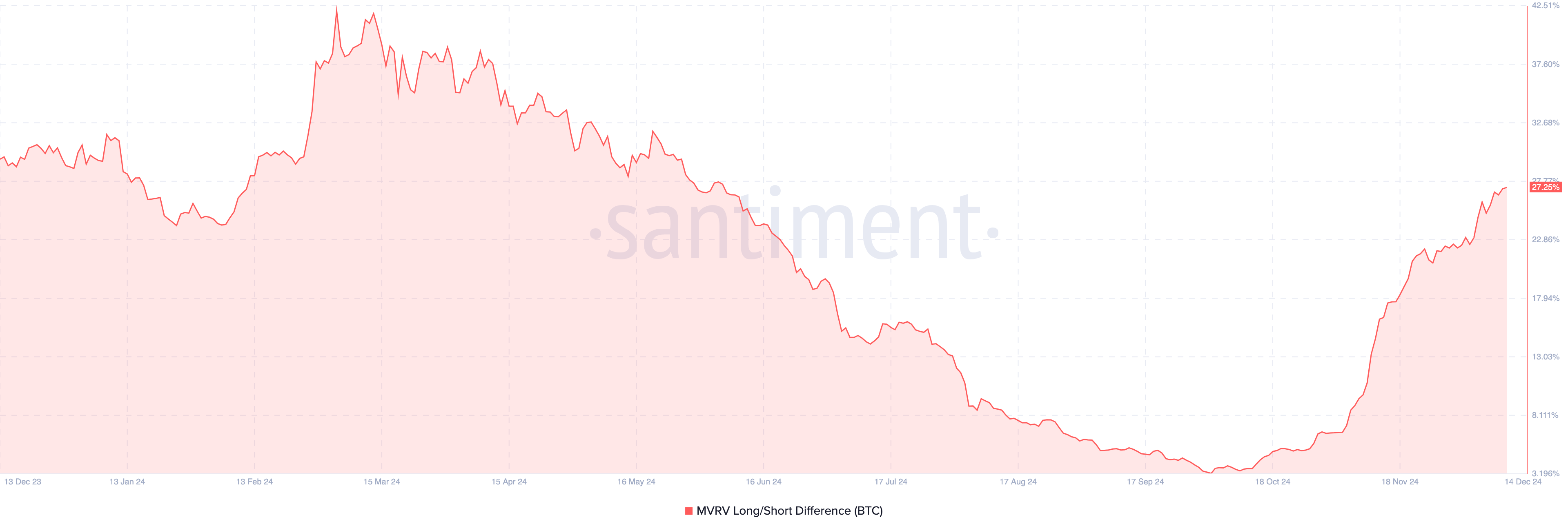 Volgens Santiment is het MVRV long/short verschil van Bitcoin gestegen naar 27,25%, wat aangeeft dat de huidige cyclus een Bitcoin bullmarkt is. Echter, de waarde ligt ver onder de 42,08, die het in maart bereikte voordat het maanden van consolidatie en correctie ervoer. Op basis van historische data suggereert deze huidige toestand dat BTC waarschijnlijk zijn all-time high zal overtreffen voordat de top van deze cyclus wordt bereikt.