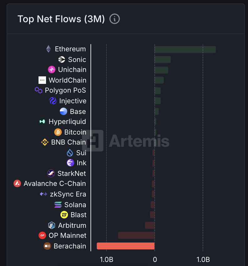 Gegevens van Artemis benadrukken de omvang van het kapitaal dat Berachain verlaat. Binnen drie maanden registreerde het platform $1,69 miljard aan instromen, maar zag het $2,89 miljard vertrekken, wat resulteerde in netto-uitstromen van meer dan $1,2 miljard. Dit positioneert Berachain als de leidende chain qua netto-uitstromen in deze periode.