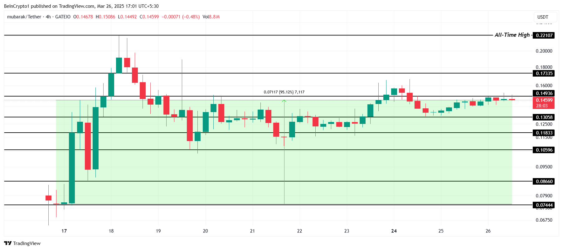 MUBARAK is deze maand gelanceerd en heeft al aanzienlijke volatiliteit ervaren. De meme coin is sinds de lancering met 95% gestegen, met de huidige all-time high (ATH) op $0,221. Deze sterke start weerspiegelt het optimisme van investeerders en een positieve marktontvangst voor de altcoin op de cryptomarkt.