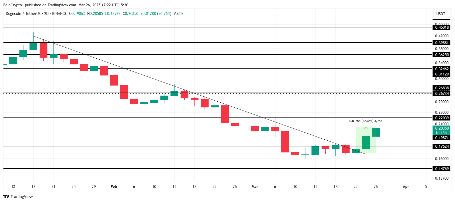 Dogecoin heeft deze maand geen uitzonderlijke winsten geboekt, maar is erin geslaagd om uit een neerwaartse trend van twee maanden te breken. De altcoin steeg in een week met 22% en wordt verhandeld op $0,203. Deze recente opwaartse beweging wijst op een mogelijke verschuiving in het marktsentiment, wat suggereert dat Dogecoin meer positieve momentum zou kunnen zien.