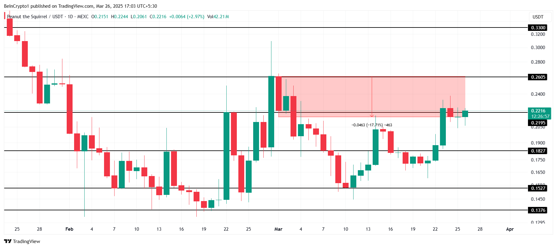 PNUT heeft deze maand een verlies van 17% geleden, maar is dichter bij het herstellen van zijn verliezen. Momenteel wordt de meme coin verhandeld op $0,221 en begint tekenen van herstel te vertonen. De recente koersbeweging van de altcoin geeft aan dat het mogelijk gepositioneerd is voor potentiële groei als de marktomstandigheden verbeteren.