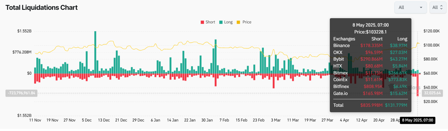 Volgens gegevens van CoinGlass werden ongeveer 190.000 handelaren geliquideerd, met totale verliezen die opliepen tot $970 miljoen. Shortposities werden het zwaarst getroffen, goed voor $836 miljoen aan verliezen. Dit is de grootste short-liquidatie sinds 2021. CoinGlass merkte ook op dat de werkelijke cijfers nog hoger kunnen zijn.