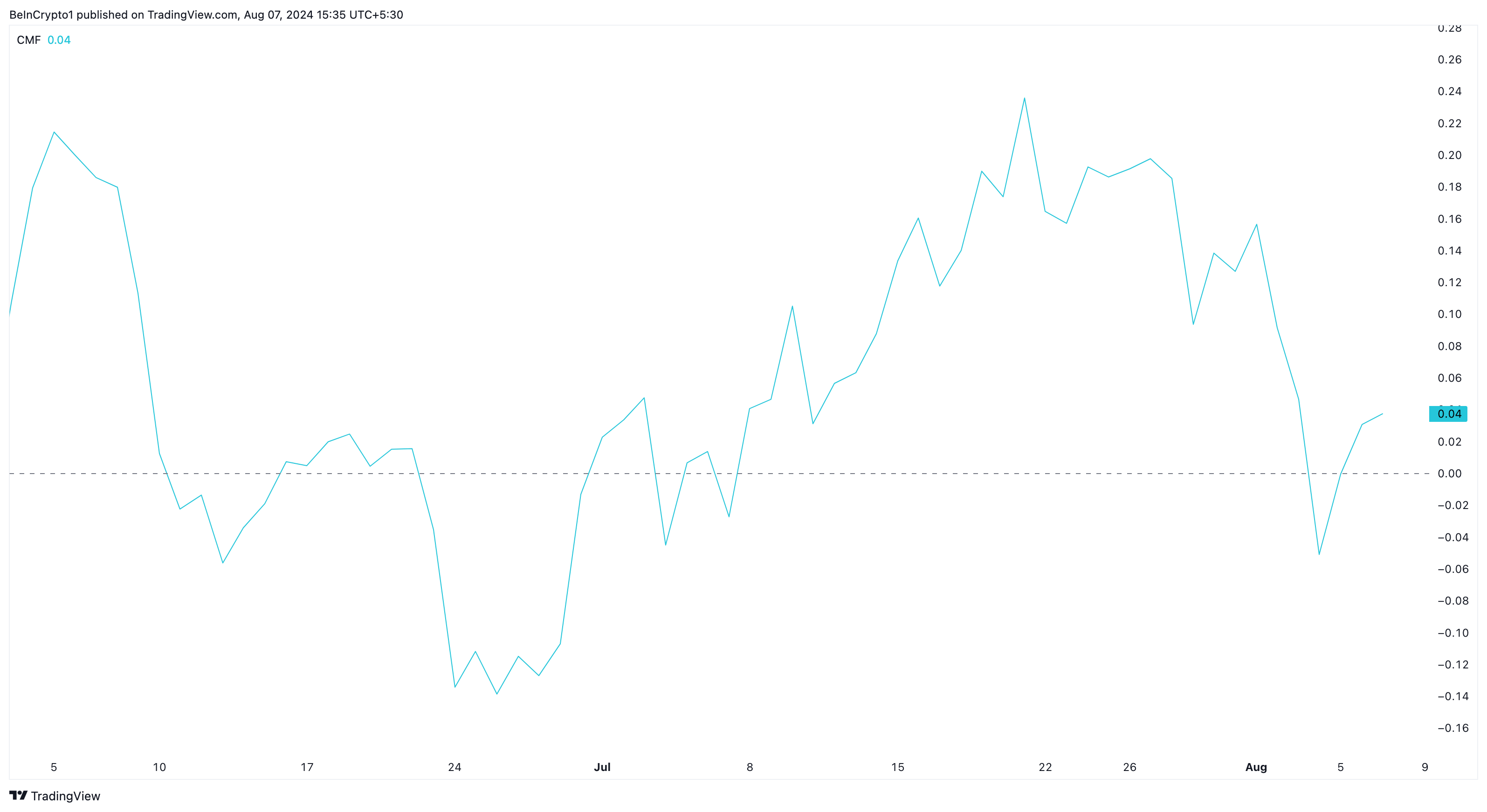 Echter, een blik op de Chaikin Money Flow (CMF) toont aan dat de koerstrend een opwaartse beweging begunstigt. CMF toont of een cryptocurrency netto accumulatie of distributie ervaart.