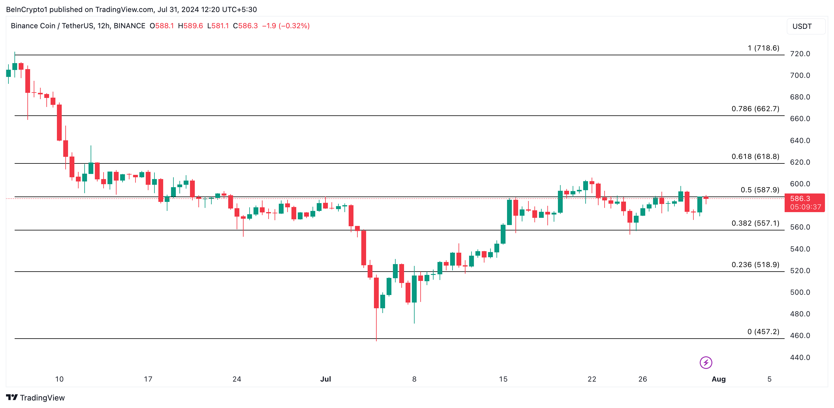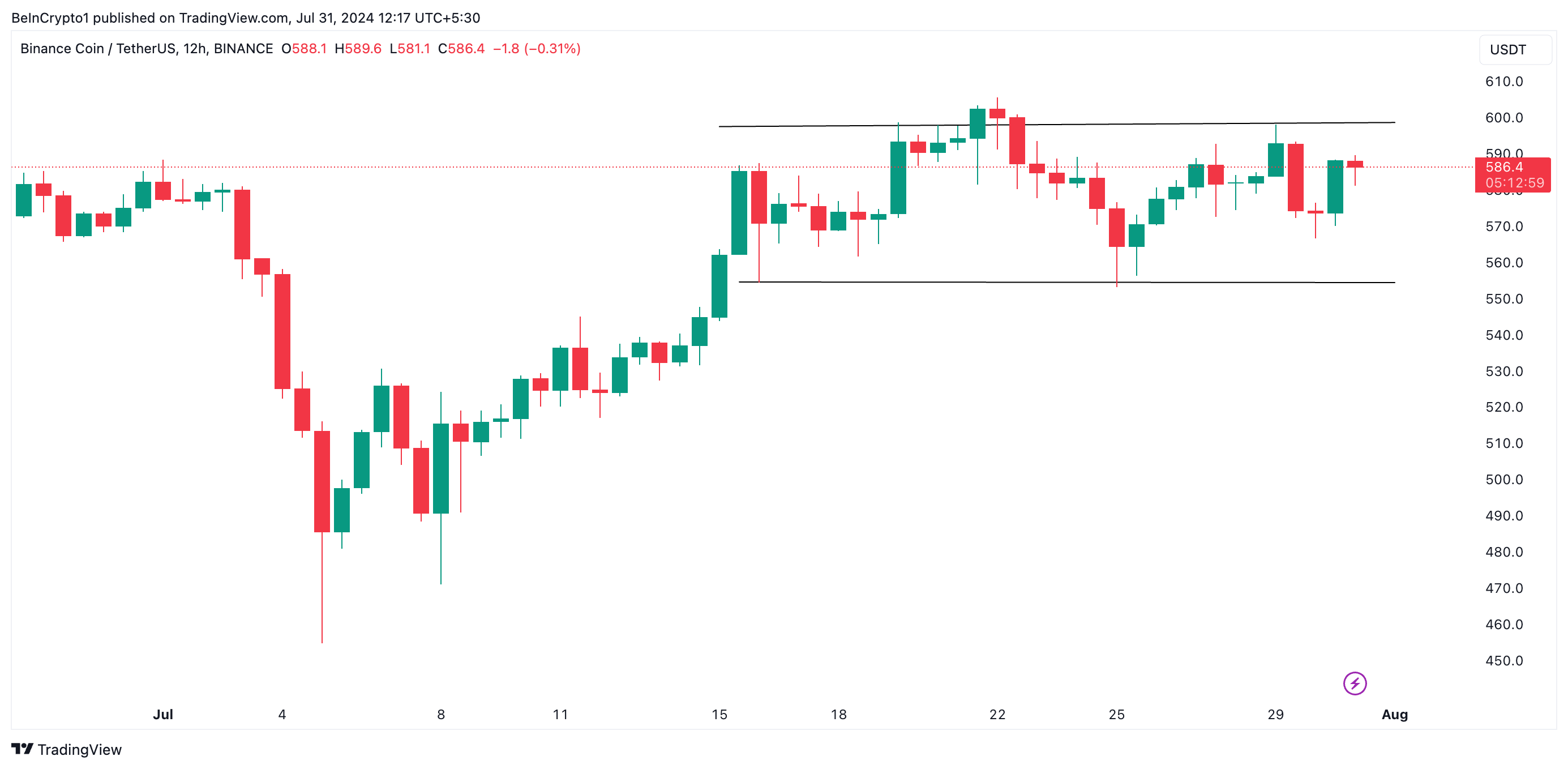 BNB heeft sinds begin juli binnen een horizontaal kanaal getrend. Dit kanaal wordt gevormd wanneer de prijs van een activum consolideert binnen een prijsbereik voor een specifieke periode. Dit gebeurt wanneer er een relatief evenwicht is tussen koop- en verkoopdruk, waardoor de prijs van het activum niet sterk in een bepaalde richting trendt.