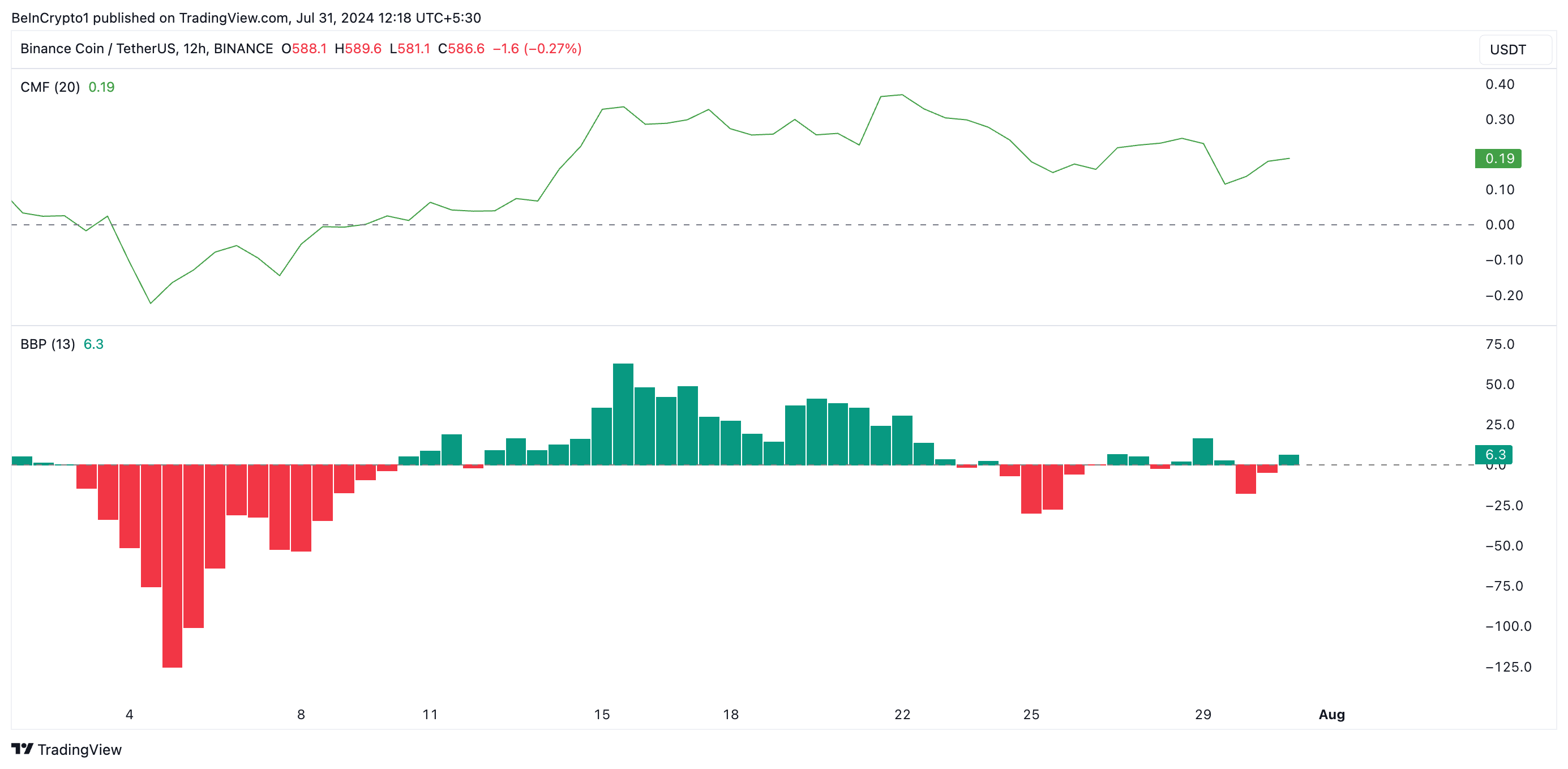 Wanneer de CMF van een activum stijgt terwijl zijn prijs zijwaarts trendt, betekent dit vaak dat beleggers in het activum kopen. Echter, verkoopdruk is ook aanwezig, waardoor de prijs in toom wordt gehouden.