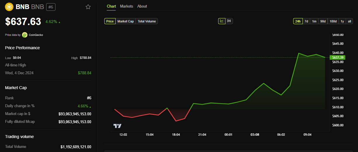 BeInCrypto gegevens tonen dat de Binance Coin koers bijna 5% steeg op dit nieuws. Op het moment van schrijven werd BNB verhandeld voor $637,63, een stijging van 4,62% sinds de sessie van dinsdag opende.