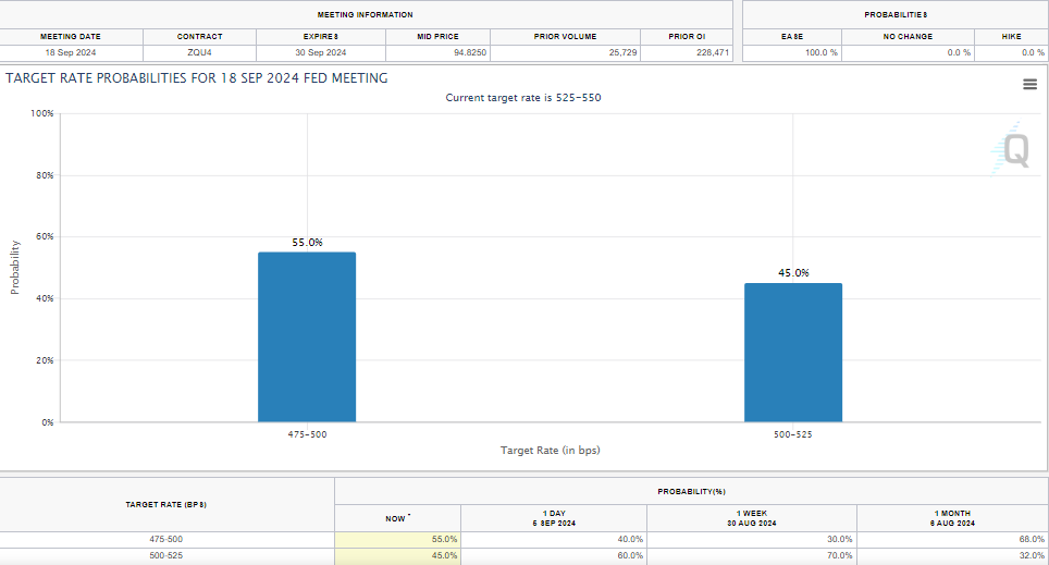 Volgens de Fed’s CME Watchtool verwachten markten nu een renteverlaging van 50 basispunten in september, waarbij de kans steeg van 30,5% naar 55%. De kans op een verlaging van 25 basispunten is gedaald naar 45%.