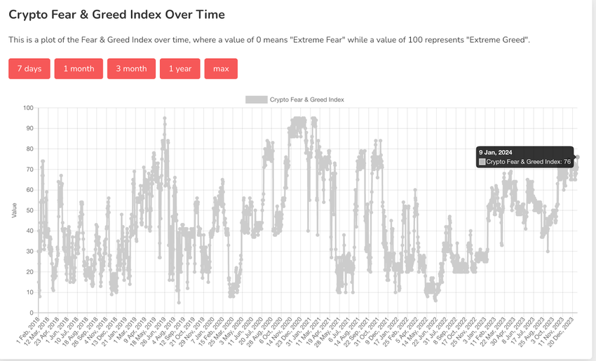 De schermafbeelding hieronder laat zien dat op 9 januari 2024 de Bitcoin Fear and Greed Index een score van 76 heeft, wat wijst op extreme hebzucht. De index heeft het “extreme hebzucht” niveau voor het eerst bereikt sinds 2021, toen Bitcoin op zijn all-time high stond.