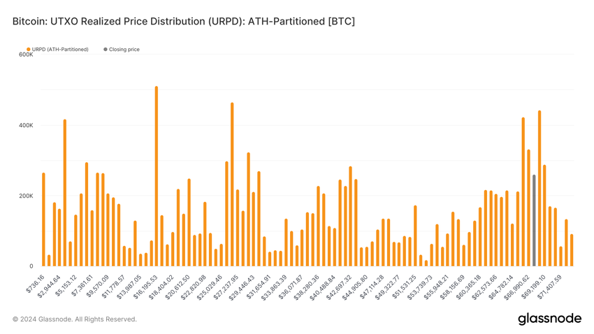Slechts 1,1% van het totale Bitcoin aanbod overschrijdt het $70.000 prijsniveau. Dit kleine percentage suggereert dat heel weinig mensen BTC kochten tegen prijzen hoger dan de huidige prijs. Bijgevolg zijn er niet veel verkopers die hun Bitcoin willen verkopen voor een snelle winst, omdat ze ofwel verlies zouden lijden of break-even zouden draaien.