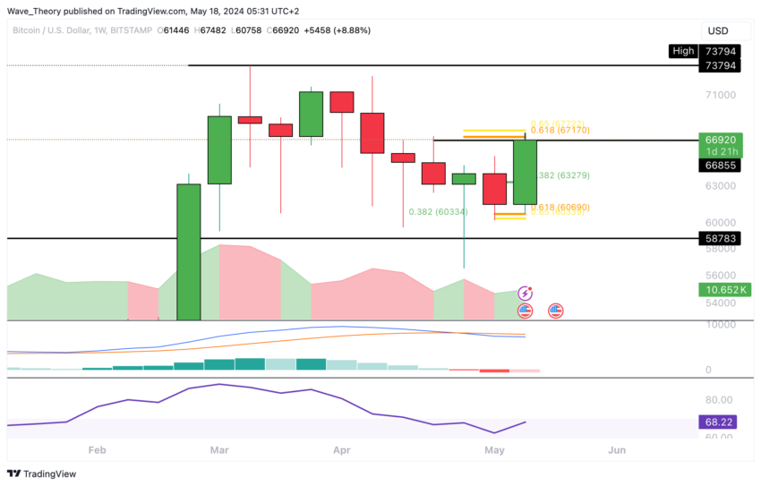 De gouden ratio nabij $67.500 valt samen met de cruciale Fibonacci-weerstand van BTC. Een bullish doorbraak op dit niveau zou een terugkeer naar een uptrend betekenen voor Bitcoin. Bijgevolg zou de correctieve beweging ongeldig worden gemaakt en zou Bitcoin kunnen streven naar of zelfs uitstijgen boven haar vorige all-time high van rond $73.800.
