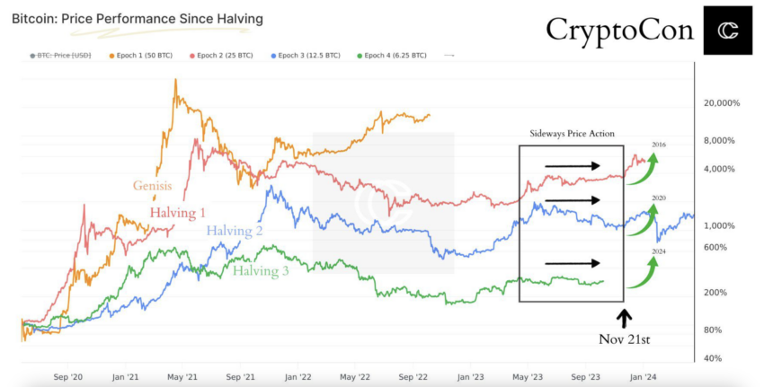 SponsoredCryptoCon’s thesis is gebaseerd op het analyseren van patronen tussen Bitcoin halvings. De grafiek hieronder toont vier golven die de prestaties van Bitcoin tussen halvings laten zien.