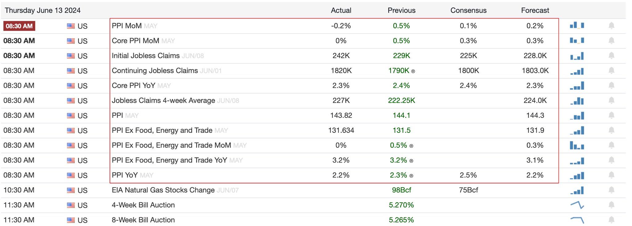 Kort daarna kondigde ook het Federal Open Market Committee (FOMC) aan dat het de rente ongewijzigd zou laten op 5,25% tot 5,50%. Op donderdag kwam de producentenprijsindex (PPI) ook uit op 2,2% op jaarbasis, volgens de prognoses en lager dan de 2,3% van april.