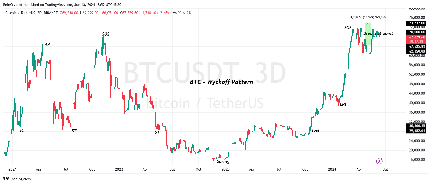 Als we echter naar het macro-tijdsbestek kijken, kan worden opgemerkt dat BTC wacht op een uitbraak volgens een Wyckoff-patroon. Het Wyckoff-patroon is een technische analysemethode die het cyclische prijsgedrag van financiële markten beschrijft. Het bestaat uit fasen van accumulatie, markup, distributie en markdown, waardoor handelaren potentiële markttrends en omkeringen kunnen identificeren.