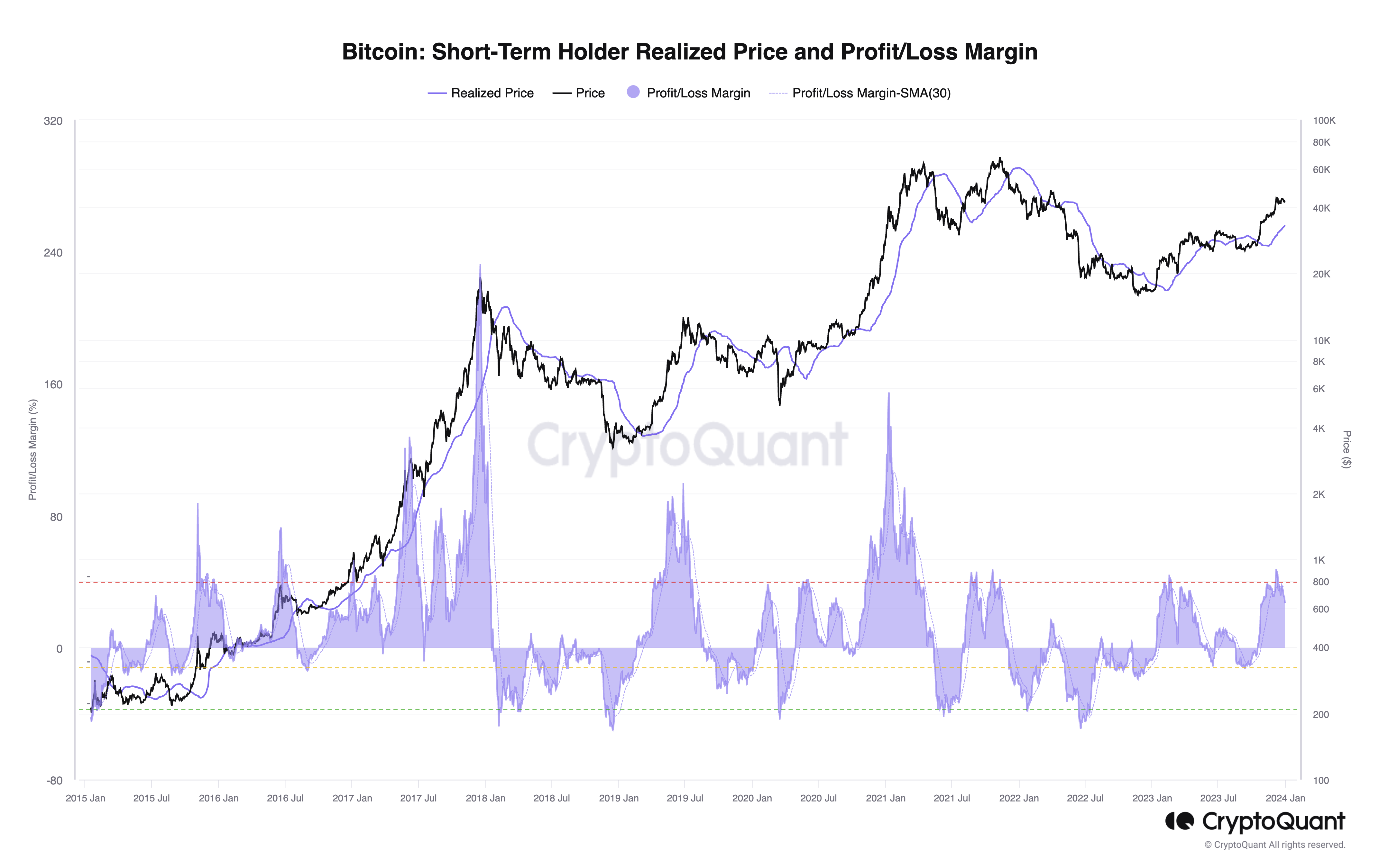 “De kans neemt toe dat de goedkeuring van de ETF een ‘sell-the-news’ gebeurtenis wordt. Dit komt omdat Bitcoin marktdeelnemers op hoge ongerealiseerde winsten zitten.Korte-termijn Bitcoin holders ervaren hoge ongerealiseerde winstmarges van 30%, wat historisch gezien voorafgaat aan koerscorrecties,” stelden analisten van CryptoQuant.