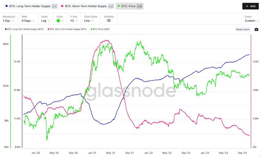 Volgens belangrijke data verkregen van Glassnode hadden langetermijnhouders 11 miljoen BTC, terwijl het aanbod van kortetermijnhouders 5 miljoen BTC bedroeg toen de Bitcoin koers piekte op $69.000 in november 2021.