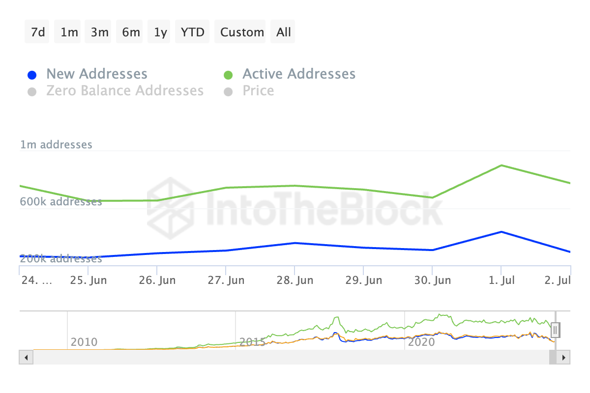 Op 1 juli bedroeg het aantal unieke adressen dat betrokken was bij ten minste één transactie met het toonaangevende cryptocurrency-asset 902.000. Dit was een stijging van 34% ten opzichte van de 674.000 dagelijks actieve adressen op het Bitcoin-netwerk op 30 juni.