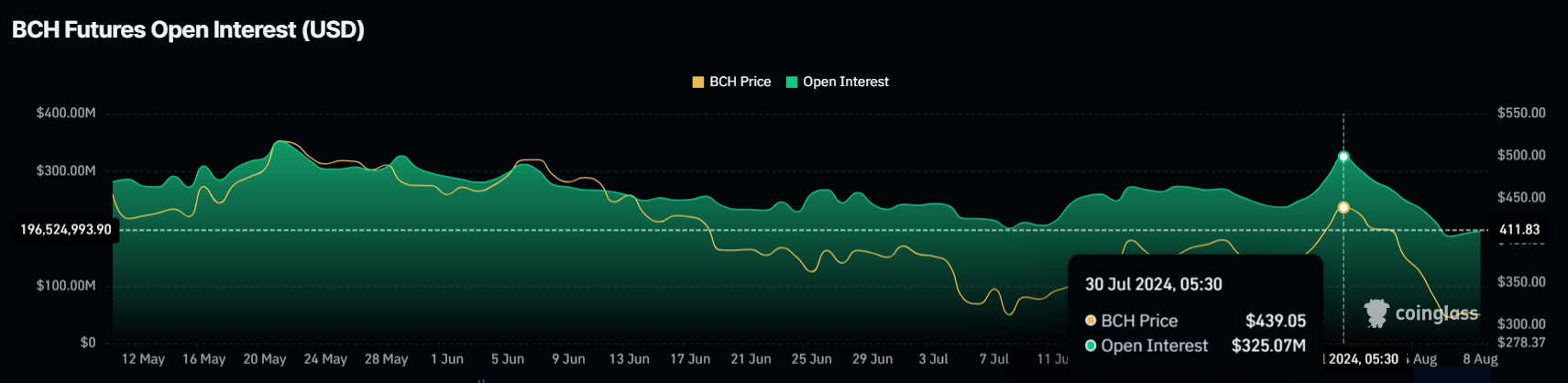 Daarnaast heeft de open interest van BCH een opmerkelijke daling ervaren, dalend van $325 miljoen naar $196 miljoen in de afgelopen negen dagen. Deze aanzienlijke vermindering van de open interest weerspiegelt een afname in deelname en handelsactiviteit.