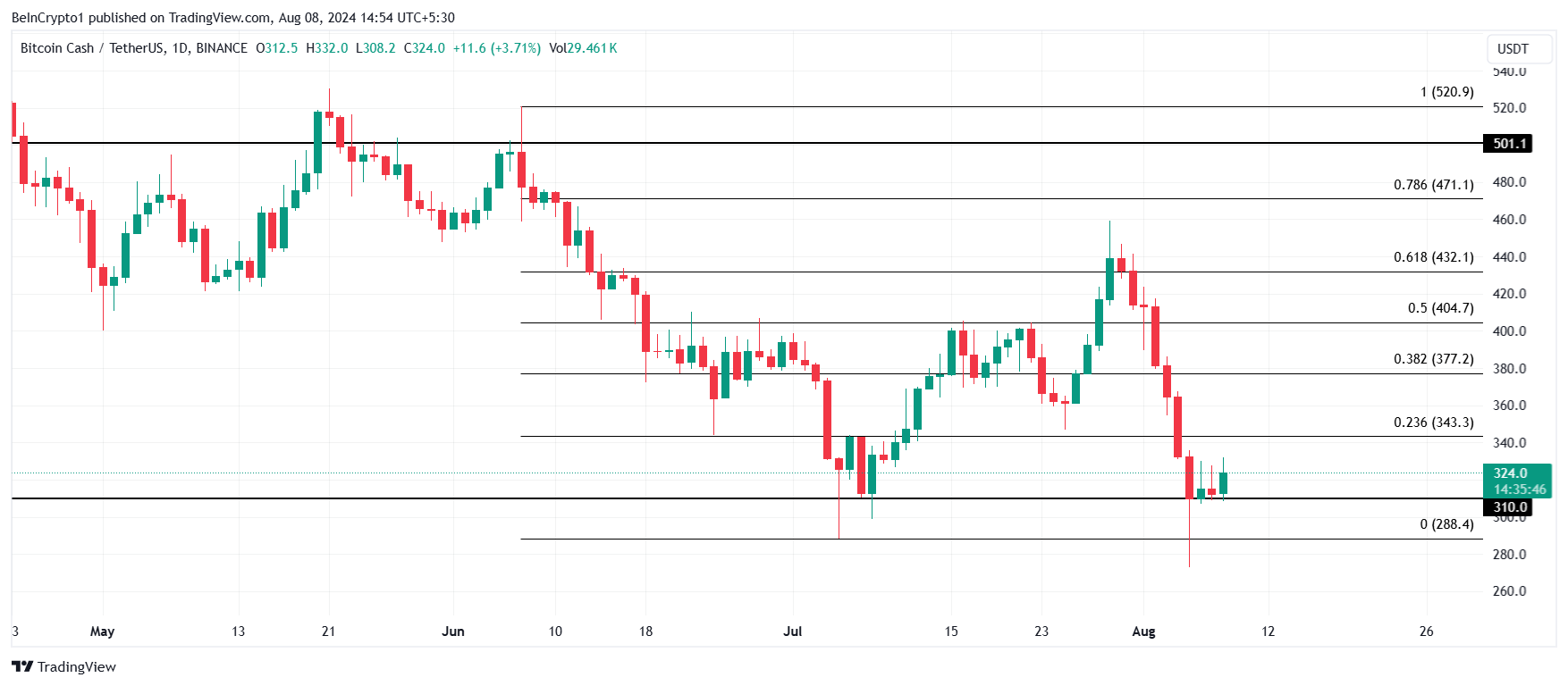 De koers van Bitcoin Cash is boven de kritieke steunvloer van $310. Dit steunniveau heeft ook in het verleden verliezen voorkomen, wat vertrouwen geeft in een herstel.