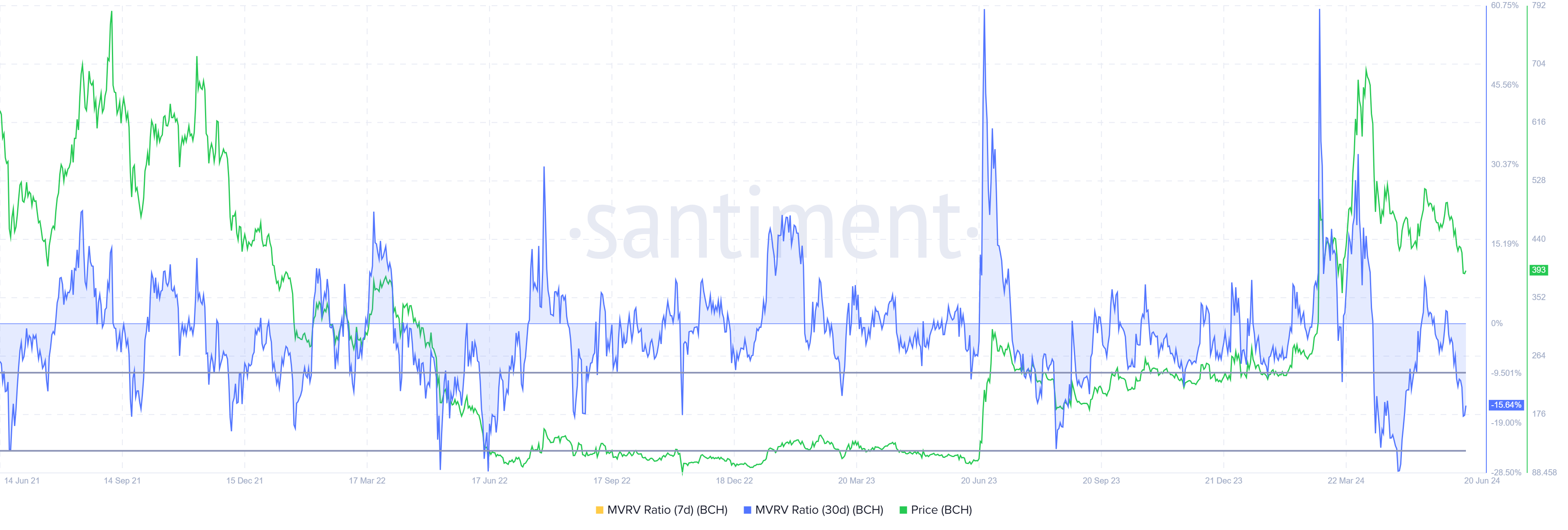 De MVRV-ratio beoordeelt de winst en het verlies van investeerders. Momenteel staat de 30-daagse MVRV van Bitcoin Cash op -16%, wat wijst op verliezen, wat kan leiden tot koopdruk. Historisch gezien geeft de MVRV van BCH tussen -9% en -25% meestal het begin aan van herstelrally’s, wat een kanszone markeert voor accumulatie.