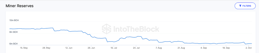 On-chain data laat zien dat de cumulatieve reservesaldi van de miners op 29 september 6,5 miljoen BCH bedroegen. Maar dat cijfer is gedaald tot slechts 6,25 miljoen BCH op 5 oktober.
