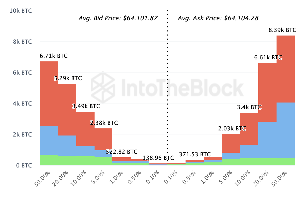 Volgens de bovenstaande afbeelding hebben deelnemers meer coins klaarstaan om verkocht te worden (ask) dan om gekocht te worden (bid) rond dezelfde koers van $64,101. Gezien het verschil in kopen en verkopen, zou de koers van Bitcoin wel eens sluiting kunnen zijn van een nieuwe daling.